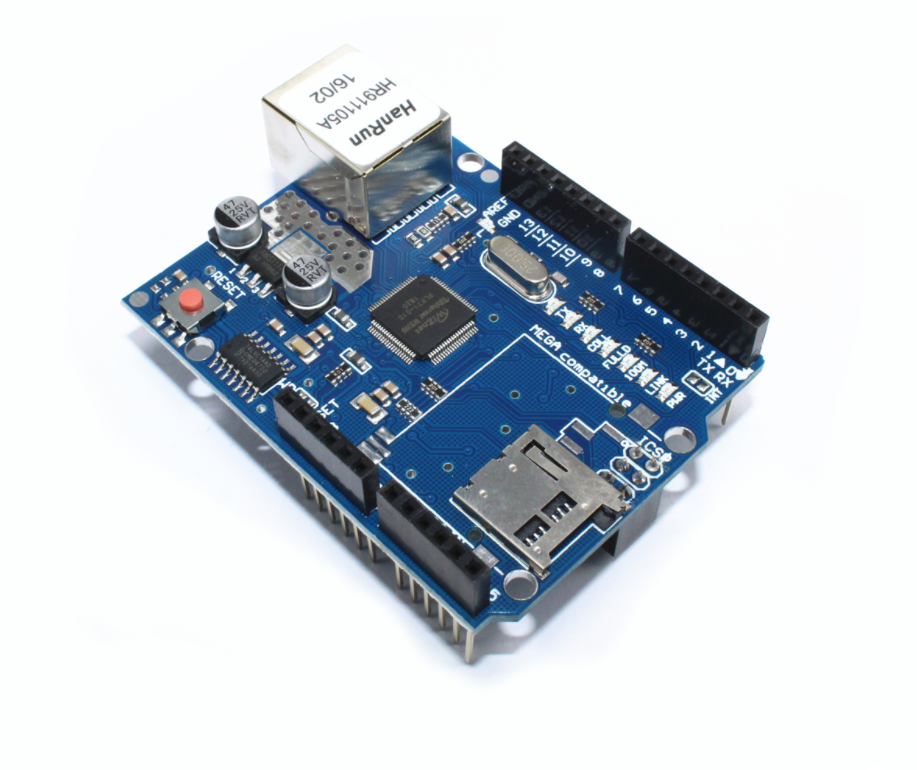 Ethernet擴展板可以讓控制器連接網絡。它是一塊內置WizNet W5100 TCP/IP微處理器的擴展板。這塊板通過長針腳排母(wire-wrap header)連接板。 使用 IDE中的Ethernet庫程序便可以輕鬆地使用這款擴展板連接到網絡中。這款擴展板支持同時4個socket的連接。 且該款擴展板的R3版本還新增了由4個額外端口組成的1.0標準版輸出端口:2個位於ARFF邊上,2個位於RESET邊上。 RESET邊上的兩個端口,一個是IOREF, 用來使擴展板適應主板。另一個空的端口預留給將來擴展的可能。 此款的版本新增micro-SD卡的插槽,擁有網絡存儲功能。此外,它和 Duemilanove,Mega系列也完全兼容。 它還擁有一個獨立的PoE( power-over-Ethernet)模塊。 該模塊可以焊接到主板上,從而通過雙絞線來傳輸電力。這是符合IEEE802.3af標準的,並和現存的PoE模塊相兼容。