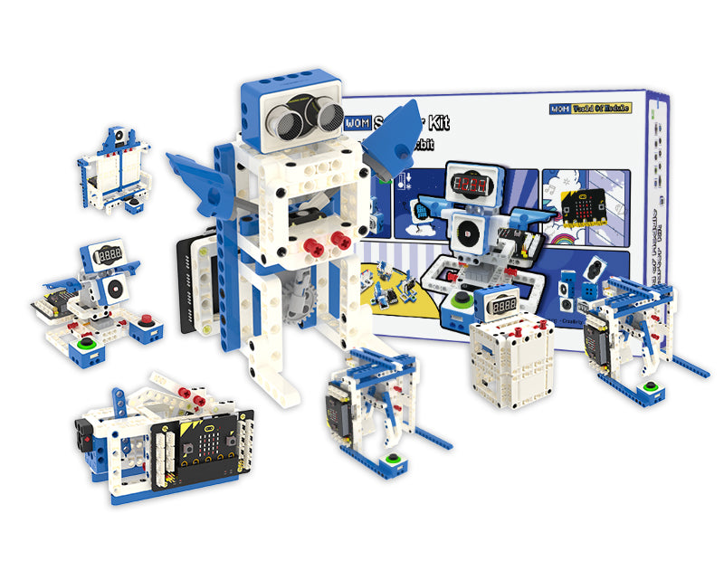 魔塊世界積木套件可編程機器人套件世界包括 1 個Microbit擴展板 Superbit、2 個積木伺服器、10 個電子傳感器模塊和 300 多個積木零件。支持MakeCode和Python編程,適合6歲以上用戶。我們創造了20多種模型,還提供了詳細的實驗案例,讓孩子們在玩積木的同時學習編程和傳感器知識。